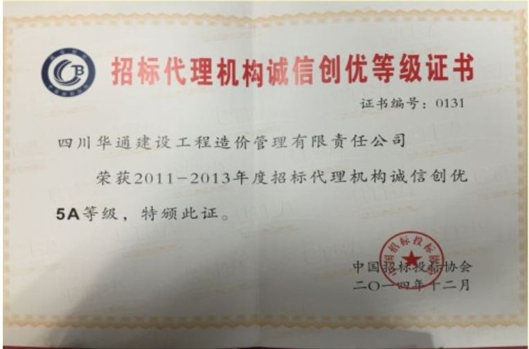 2014年招标代理机构诚信创优等级证书
